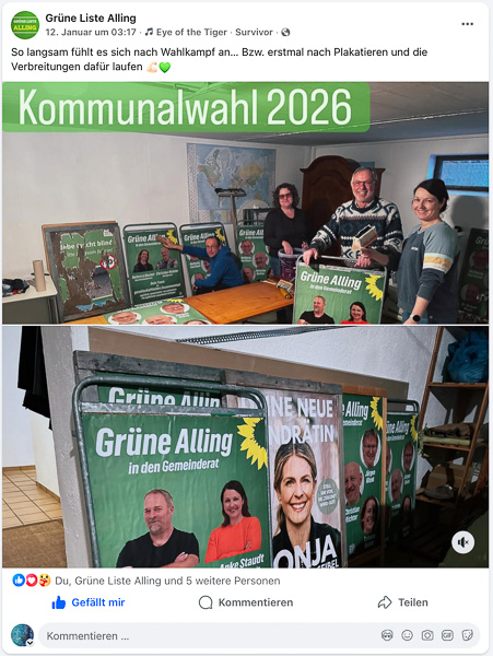 Wir veröffentlichen unsere Aktivitäten und Informationen über unsere Gemeinderats-Kandidaten auch auf Facebook. Schauen Sie gerne mal rein: Facebook Grüne Alling