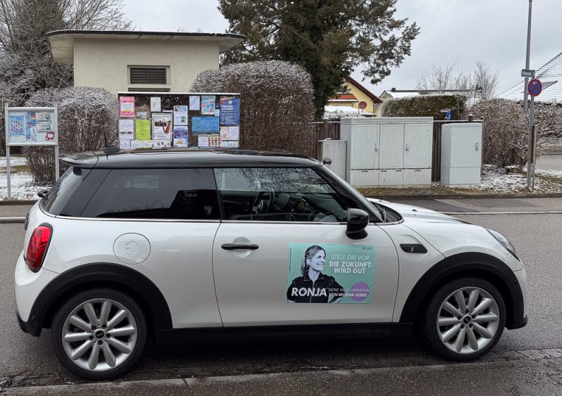 Der Wahlkampf tritt kurz vor der Wahl in die heiße Phase. Auf unseren Autos werben wir nun für unsere neue Landrätin Ronja von Wurmb-Seibel. Und verteilen auch ihre Flyer an die Allinger Haushalte.